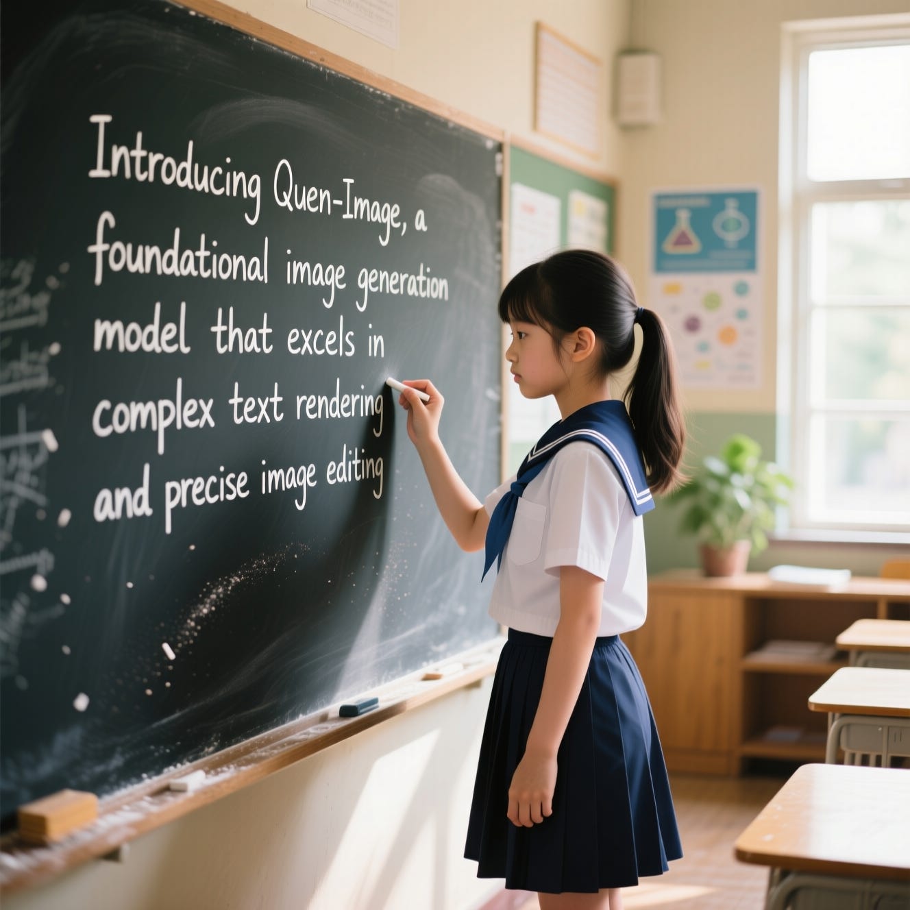 A young girl wearing a school uniform stands in a classroom, writing on a chalkboard. The text "Introducing Qwen-Image, a foundational image generation model that excels in complex text rendering and precise image editing" appears in neat white chalk at the center of the blackboard. Soft natural light filters through windows, casting gentle shadows. The scene is rendered in a realistic photography style with fine details, shallow depth of field, and warm tones. The girl's focused expression and chalk dust in the air add dynamism. Background elements include desks and educational posters, subtly blurred to emphasize the central action. Ultra-detailed 32K resolution, DSLR-quality, soft bokeh effect, documentary-style composition.