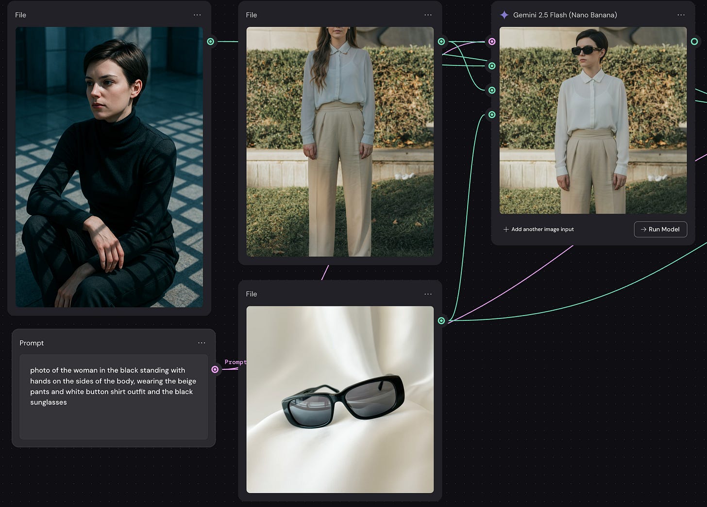 I watched several demos of multiple items of clothing being “dressed” onto an existing image of a model and they were almost flawless. Like in this Weavy demo, the women in black wears the sunglasses and outfit of the woman in the middle; final result on the right.